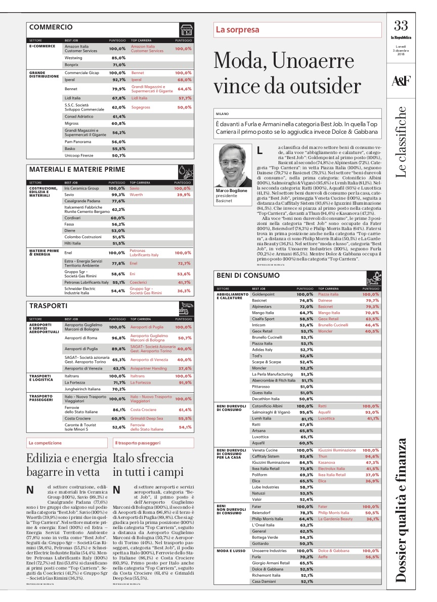 La graduatoria finale, risultato dell’integrazione ed elaborazione dei dati raccolti, sia sul web attraverso il social media listening (rilevando un totale di 360.000 citazioni in un arco temporale di sei mesi), che tramite un questionario rivolto alle imprese, ha consentito di individuare le eccellenze per l’assegnazione dei due riconoscimenti in palio, “Best Job” e “Top Carriera”.